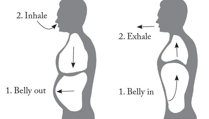 2. Take a slow, deep nasal (through your nose, not your mouth) breath in. This should be an “abdominal” breath (your belly gets bigger when you inhale, NOT your chest). Try it, you’ll see what I mean.